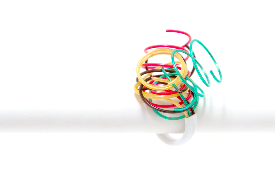 I make these rings out of discarded telephone cords that I find anywhere from flea markets and garage sales to the deepest darkest corners of IT storage closets. I love that they look fairly boring on the outside, but when you open them up they're filled with really interesting color combinations. You can TOTALLY tell the ones that were made in the 80s.