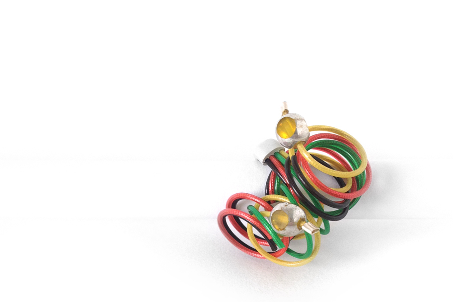 This particular ring has a white band and black, brick red, green and yellow wires with two really cool silver and yellow globe beads that look like orbiting moons.