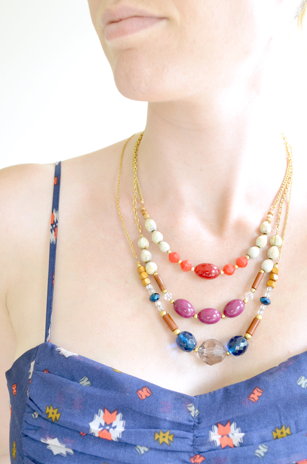 Colorful boho chic necklaces refashioned from vintage and used jewelry - The "Raven" necklace is a triple strand of strong and moody reds, purples and blues with wooden accents.
