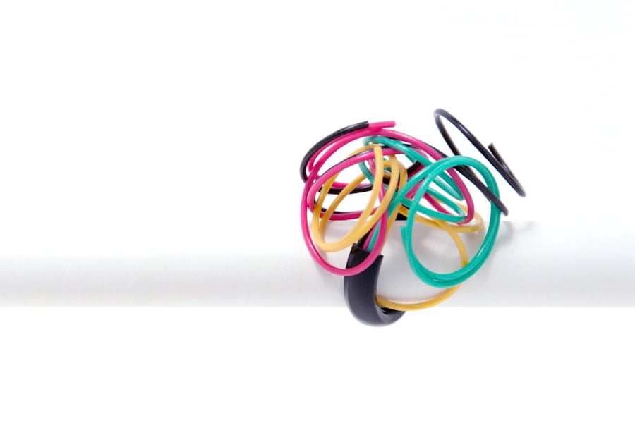 I make these rings out of discarded telephone cords that I find anywhere from flea markets and garage sales to the deepest darkest corners of IT storage closets. I love that they look fairly boring on the outside, but when you open them up they're filled with really interesting color combinations. You can TOTALLY tell the ones that were made in the 80s.