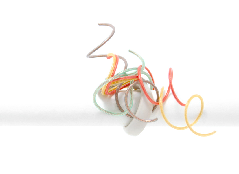I make these rings out of discarded telephone cords that I find anywhere from flea markets and garage sales to the deepest darkest corners of IT storage closets. I love that they look fairly boring on the outside, but when you open them up they're filled with really interesting color combinations. You can TOTALLY tell the ones that were made in the 80s.
