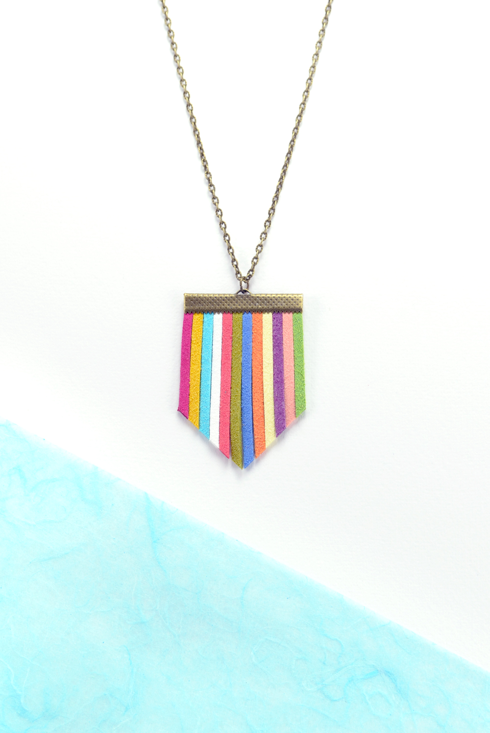 This tribal inspired necklace is made of colorful strands of vegan leather fringe on an antiqued bronze chain.